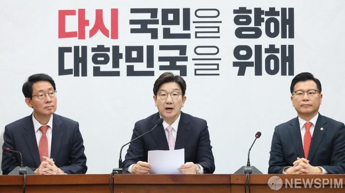 [서울=뉴스핌] 이호형 기자 = 권성동 국민의힘 원내대표가 8일 오전 서울 여의도 국회에서 열린 원내대책회의에서 모두발언을 하고 있다. 2025.04.08 leemario@newspim.com