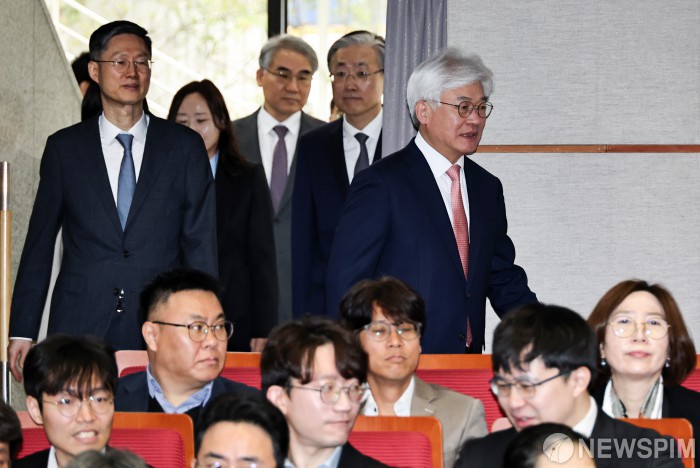 [서울=뉴스핌] 최지환 기자 = 마은혁 신임 헌법재판관이 9일 오전 서울 종로구 헌법재판소 대강당에서 열린 취임식에서 헌법재판관들과 입장하고 있다. 2025.04.09 choipix16@newspim.com
