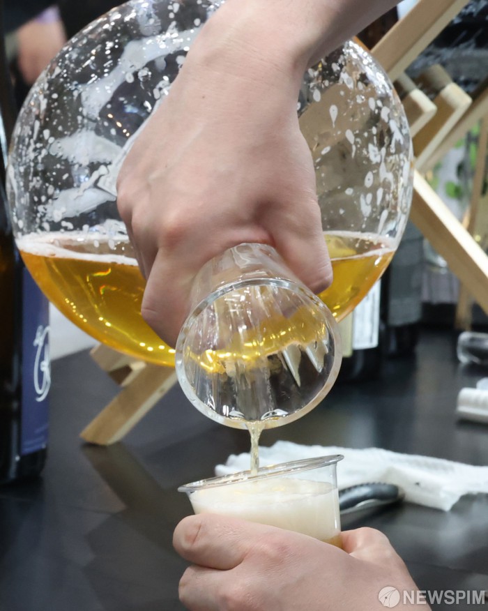 [서울=뉴스핌] 이호형 기자 = 제7회 대한민국 맥주박람회& 드링크서울이 10일 서울 강남구 코엑스 B홀에서 열린 가운데 한 맥주 부스서 방문객을 위해 시음 맥주를 따르고 있다. 2025.04.10 leemario@newspim.com