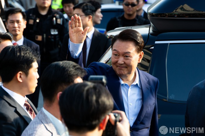 [서울=뉴스핌] 김학선 기자 = 윤석열 전 대통령이 11일 서울 용산구 한남동 대통령 관저를 떠나 서초동 사저로 이동하며 지지자들과 인사를 하고 있다. 2025.04.11 yooksa@newspim.com