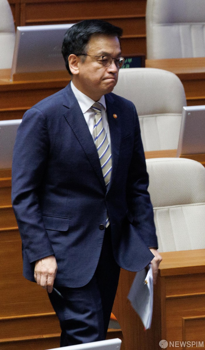 [서울=뉴스핌] 윤창빈 기자 = 최상목 부총리 겸 기획재정부 장관이 15일 오후 서울 여의도 국회 본회의에서 열린 경제에 관한 질문에서 이종배 국민의힘 의원 질의에 답변하기 위해 단상으로 나서고 있다. 2025.04.15 pangbin@newspim.com