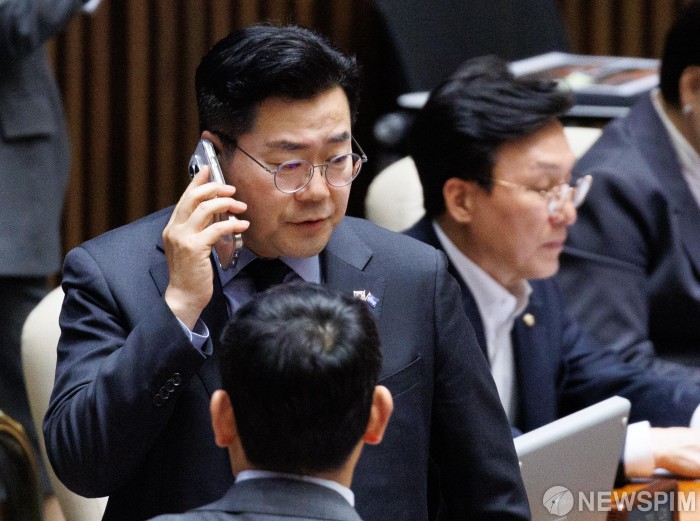 [서울=뉴스핌] 윤창빈 기자 = 박찬대 더불어민주당 직무대행 겸 원내대표가 15일 오후 서울 여의도 국회에서 열린 본회의에서 통화를 하고 있다. 2025.04.15 pangbin@newspim.com