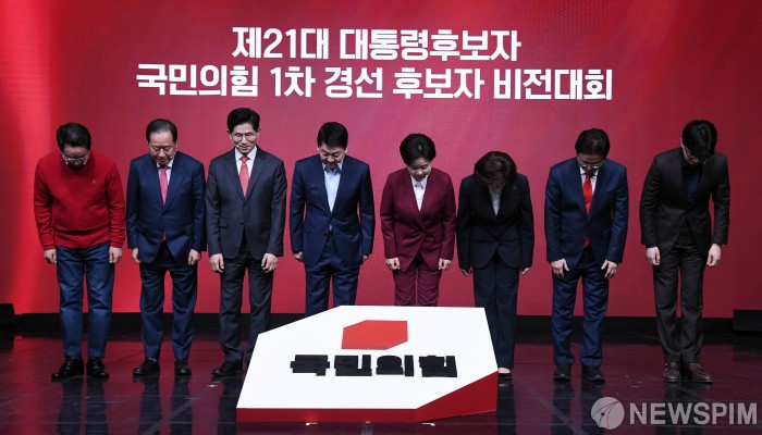 [서울=뉴스핌] 국회사진취재단 = 18일 오후 서울 강서구 ASSA아트홀에서 열린 '제21대 대통령후보자 국민의힘 1차 경선 후보자 비전대회' 에 참석한 후보들이 고개숙여 인사하고 있다. 왼쪽부터 유정복, 홍준표, 김문수, 안철수, 양향자, 나경원, 이철우, 한동훈 후보. 2025.04.18 photo@newspim.com