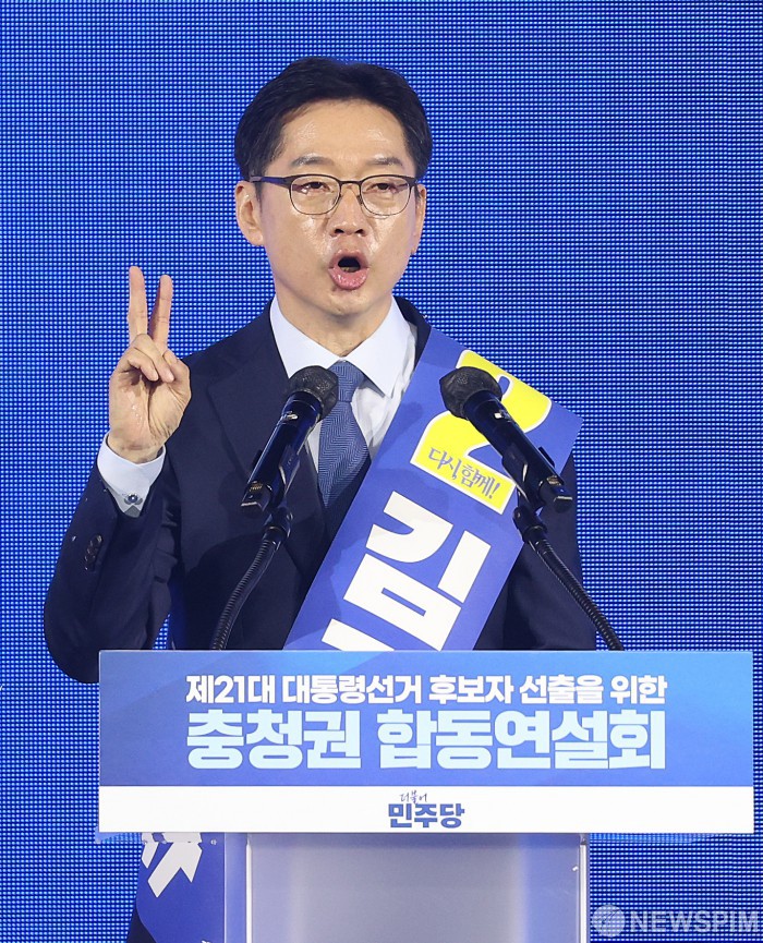 [청주=뉴스핌] 정일구 기자 = 김경수 더불어민주당 대선 경선 후보가 19일 오후 충북 청주시 청주체육관에서 열린 제21대 대통령선거 후보자 선출을 위한 충청권 합동연설회에서 정견발표를 하고 있다. 2025.04.19 mironj19@newspim.com