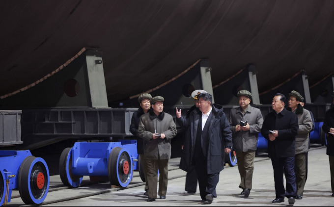 | [서울=뉴스핌] 이영종 통일전문기자 = 김정은 북한 국무위원장이 지난 3월 초 선박 건조 현장을 돌아보는 모습. 김정은 뒤편으로 잠수함으로 추정되는 선체가 드러나는데, 북한 선전매체들은 3월 8일 보도에서 "노동당 제8차 대회(2021년 1월) 결정에 따라 추진되고 있는 핵 동력 전략 유도탄 잠수함 건조실태도 현지에서 요해했다"고 전했다. [사진=화보 조선] 2025.11.17 yjlee@newspim.com |