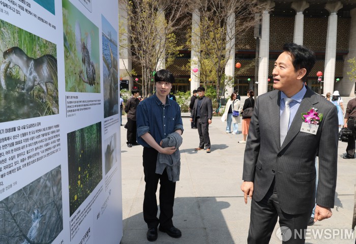 [서울=뉴스핌] 사진공동취재단 = 오세훈 서울시장이 21일 오전 서울 광화문광장 놀이마당에서 개막한 제61회 한국보도사진전에 참석해 작품을 관람하고 있다. 전시는 24일까지 광화문광장 일대에서 진행된다. 2025.04.21 photo@newspim.com