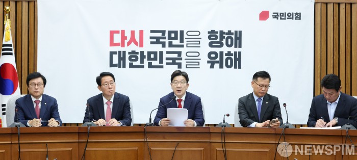 [서울=뉴스핌] 정일구 기자 = 권성동 국민의힘 원내대표가 22일 오전 서울 여의도 국회에서 열린 원내대책회의에서 모두발언을 하고 있다. 2025.04.22 mironj19@newspim.com