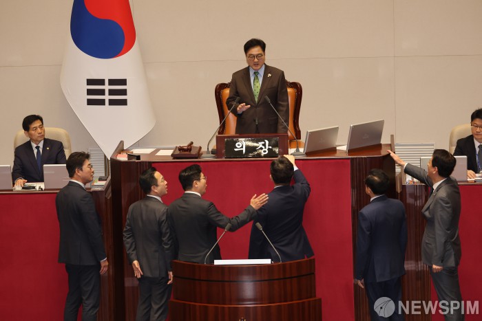 [서울=뉴스핌] 정일구 기자 = 권성동 국민의힘 원내대표가 24일 오전 서울 여의도 국회 본회의장에서 열린 제242회 국회(임시회) 제6차 본회의에서 우원식 국회의장의 발언에 항의하고 있다. 2025.04.24 mironj19@newspim.com
