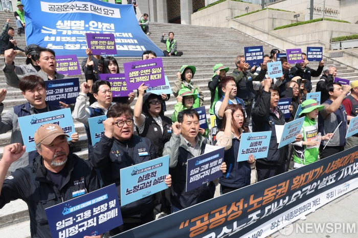 [서울=뉴스핌] 김학선 기자 = 민주노총 공공운수노조가 24일 서울 광화문 세종문화회관 계단에서 "공공성-노동권 확대가 사회대개혁!" 21대 대선 요구안 발표 기자회견을 하고 있다. 2025.04.24 yooksa@newspim.com