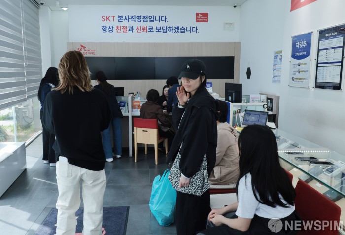 [서울=뉴스핌] 이길동 기자 = 27 일 서울시내 SK텔레콤 대리점을 찾은 고객들이 유심 카드 교체 예약을 위해 대기하고 있다.SK텔레콤은 오는 28일 오전 10시부터 가입자들에게 유심(eSIM 포함) 무료 교체서비스를 제공할 예정이다.2025.04.27 gdlee@newspim.com