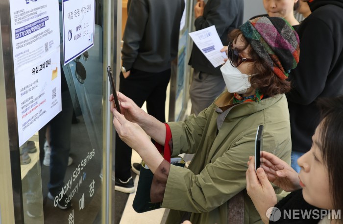 [서울=뉴스핌] 양윤모 기자 = SK텔레콤 고객이 28일 오전 서울 종로구 T월드 매장을 찾아 사이버 침해 피해 우려속 유심 무료 교체 서비스를 받기위해 대기하며 안내문을 확인하고 있다. 2025.04.28 yym58@newspim.com