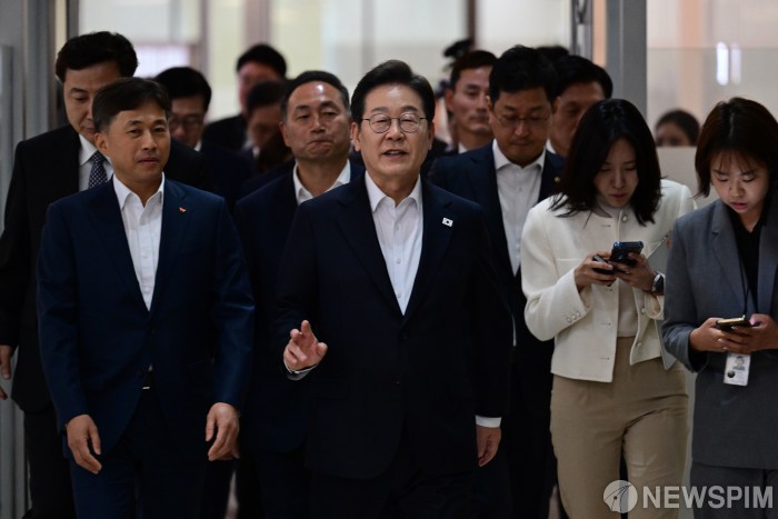 [이천=뉴스핌] 국회사진취재단 = 이재명 더불어민주당 대선 후보와 곽노정 SK하이닉스 대표이사 사장이 28일 오후 경기도 이천시 SK하이닉스 이천캠퍼스에서 열린 'K-반도체' AI메모리반도체 기업 간담회에 참석하고 있다. 2025.04.28 photo@newspim.com