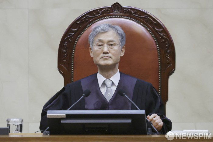 [서울=뉴스핌] 사진공동취재단 = 조희대 대법원장이 1일 오후 더불어민주당 이재명 대선 후보의 공직선거법 사건 전원합의체 선고를 위해 서울 서초구 대법원 대법정에 입장해 자리에 앉아 있다. 2025.05.01 photo@newspim.com