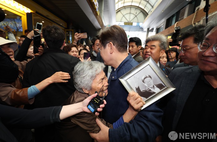 [철원=뉴스핌] 최지환 기자 = 이재명 더불어민주당 대선 후보가 '골목골목 경청투어' 접경지역 방문 이틀째인 2일 오전 강원 철원군 동송전통시장에서 한 주민과 포옹하고 있다. 2025.05.02 choipix16@newspim.com