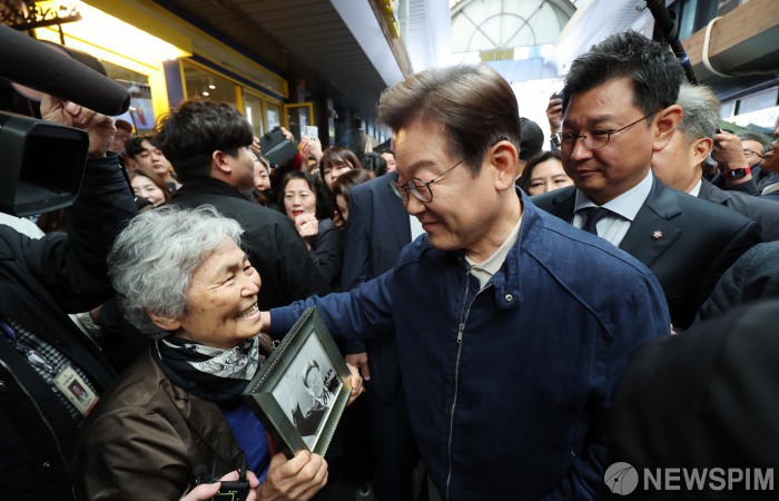 [철원=뉴스핌] 최지환 기자 = 이재명 더불어민주당 대선 후보가 '골목골목 경청투어' 접경지역 방문 이틀째인 2일 오전 강원 철원군 동송전통시장에서 주민과 대화를 나누고 있다. 2025.05.02 choipix16@newspim.com