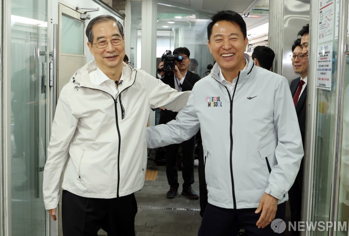 [서울=뉴스핌] 양윤모 기자 = 제21대 대선 출마를 선언한 한덕수 전 국무총리가 2일 오후 오세훈 서울시장과 함께 서울 종로구의 주민공동시설 '새뜰집'에서 대선 행보를 시작했다. [공동취재] 2025.05.02 yym58@newspim.com
