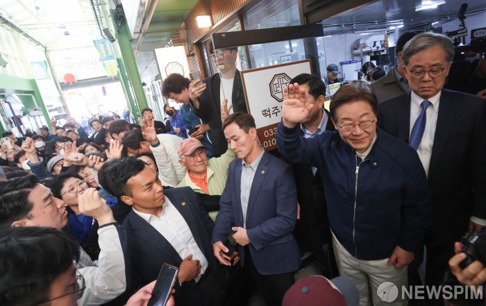 [인제=뉴스핌] 최지환 기자 = 이재명 더불어민주당 대선 후보가 '골목골목 경청투어' 접경지역 방문 이틀째인 2일 오후 강원 인제군 원통시장에서 시민들과 인사를 나누고 있다. 2025.05.02 choipix16@newspim.com