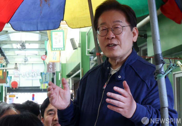 [인제=뉴스핌] 최지환 기자 = 이재명 더불어민주당 대선 후보가 '골목골목 경청투어' 접경지역 방문 이틀째인 2일 오후 강원 인제군 원통시장에서 주민들을 향해 연설하고 있다. 2025.05.02 choipix16@newspim.com