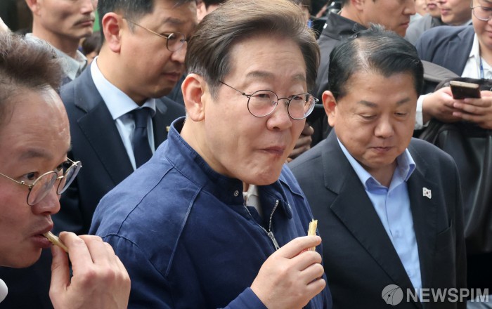 [인제=뉴스핌] 최지환 기자 = 이재명 더불어민주당 대선 후보가 '골목골목 경청투어' 접경지역 방문 이틀째인 2일 오후 강원 인제군 원통시장에서 황태포를 시식하고 있다. 2025.05.02 choipix16@newspim.com