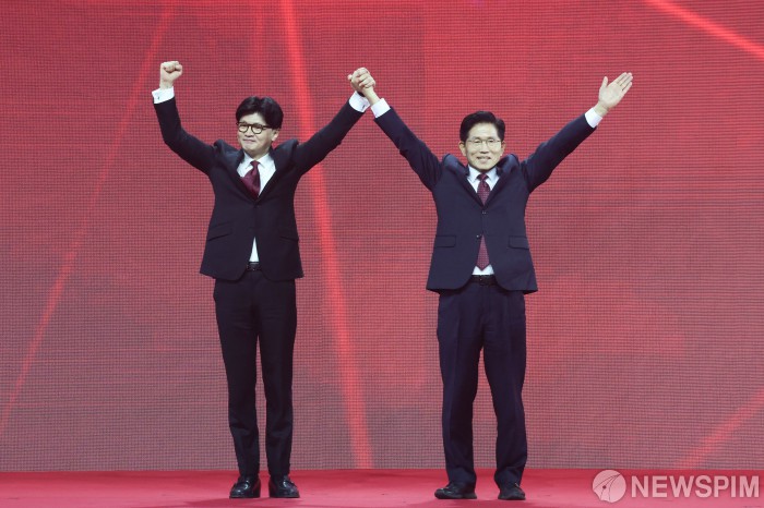 [고양=뉴스핌] 최지환 기자 = 김문수, 한동훈 국민의힘 경선 후보가 3일 오후 경기 고양시 킨텍스에서 열린 국민의힘 제5차 전당대회에서 당원들에게 인사하고 있다. 2025.05.03 choipix16@newspim.com