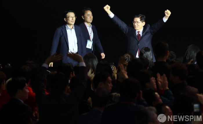 [고양=뉴스핌] 최지환 기자 = 김문수 국민의힘 경선후보가 3일 오후 경기 고양시 킨텍스에서 열린 국민의힘 제5차 전당대회에 입장하고 있다. 2025.05.03 choipix16@newspim.com
