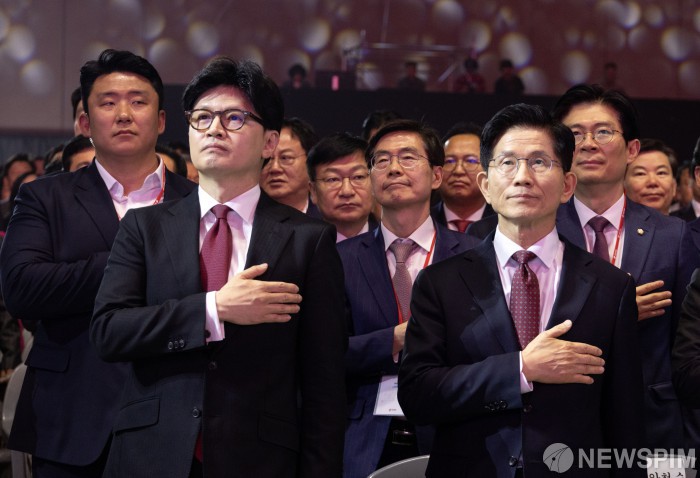 [서울=뉴스핌] 국회사진취재단 = 김문수, 한동훈 국민의힘 대선 경선 후보가 3일 오후 경기 고양시 킨텍스에서 열린 국민의힘 제5차 전당대회에서 국민의례를 하고 있다. 2025.05.03 photo@newspim.com