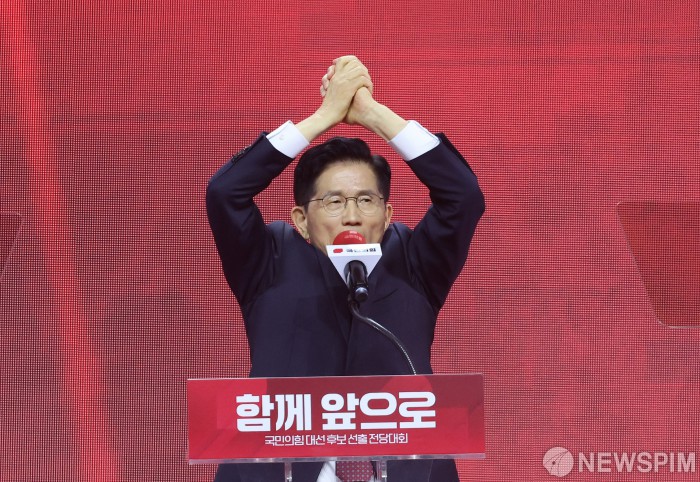 [서울=뉴스핌] 국회사진취재단 = 국민의힘 대선후보로 선출된 김문수 후보가 3일 오후 경기 고양시 킨텍스에서 열린 국민의힘 제5차 전당대회에서 수락연설을 하고 있다. 2025.05.03 photo@newspim.com