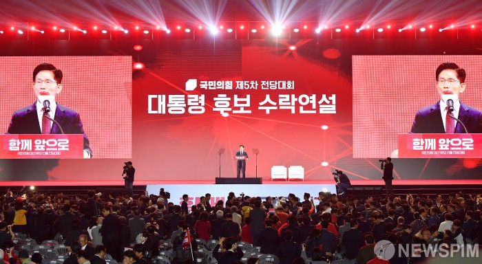 [서울=뉴스핌] 국회사진취재단 = 국민의힘 대선후보로 선출된 김문수 후보가 3일 오후 경기 고양시 킨텍스에서 열린 국민의힘 제5차 전당대회에서 수락연설을 하고 있다. 2025.05.03 photo@newspim.com