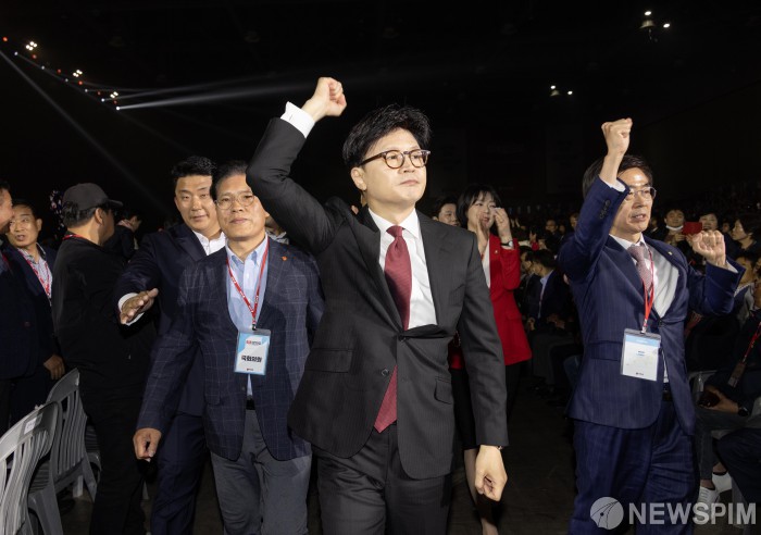 [서울=뉴스핌] 국회사진취재단 = 한동훈 국민의힘 대선 경선후보가 3일 오후 경기 고양시 킨텍스에서 열린 국민의힘 제5차 전당대회에 입장하고 있다. 2025.05.03 photo@newspim.com