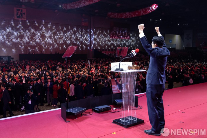 [서울=뉴스핌] 국회사진기자단 = 국민의힘 대선후보로 선출된 김문수 후보가 3일 오후 경기 고양시 킨텍스에서 열린 국민의힘 제5차 전당대회에서 수락연설을 하고 있다. 2024.05.03 photo@newspim.com