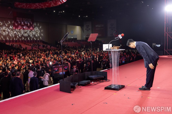 [서울=뉴스핌] 국회사진기자단 = 국민의힘 대선후보로 선출된 김문수 후보가 3일 오후 경기 고양시 킨텍스에서 열린 국민의힘 제5차 전당대회에서 수락연설 전 고개 숙여 인사하고 있다. 2024.05.03 photo@newspim.com