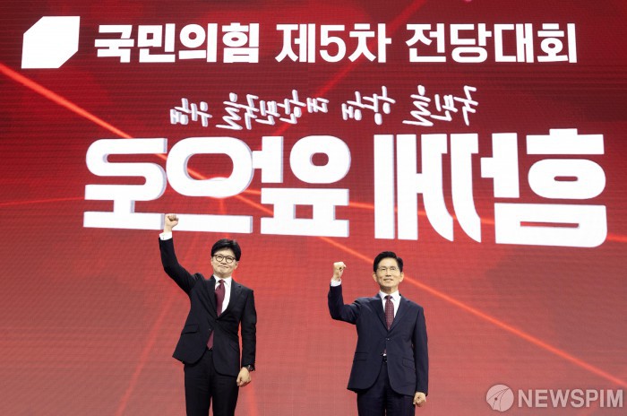 [서울=뉴스핌] 국회사진기자단 = 김문수, 한동훈 국민의힘 대선 경선 후보가 3일 오후 경기 고양시 킨텍스에서 열린 국민의힘 제5차 전당대회에 자리해 있다. 2024.05.03 photo@newspim.com