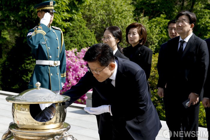 [서울=뉴스핌] 이호형 기자 = 김문수 국민의힘 대통령선거 후보가 4일 오전 서울 동작구 국립서울현충원 박정희 전 대통령 묘역을 찾아 분향하고 있다. 2025.05.04 leemario@newspim.com