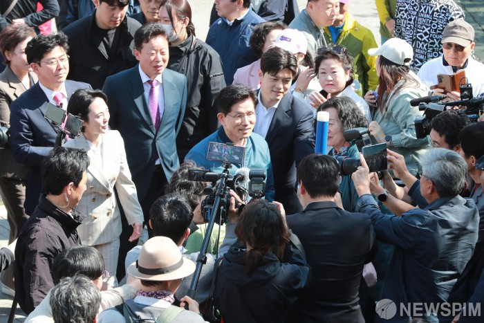 [포천=뉴스핌] 이형석 기자 = 김문수 국민의힘 대선후보가 4일 오후 경기 포천시 신평리 장자마을을 찾아 한센인들과 인사를 나누고 있다. 2025.05.04 leehs@newspim.com
