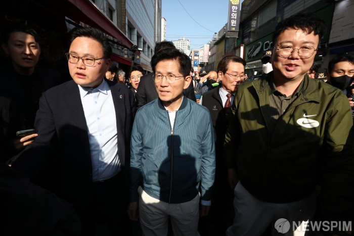 [의정부=뉴스핌] 이형석 기자 = 김문수 국민의힘 대선후보가 4일 오후 경기도 의정부 제일시장을 찾아 시민들과 인사를 나누고 있다. 2025.05.04 leehs@newspim.com