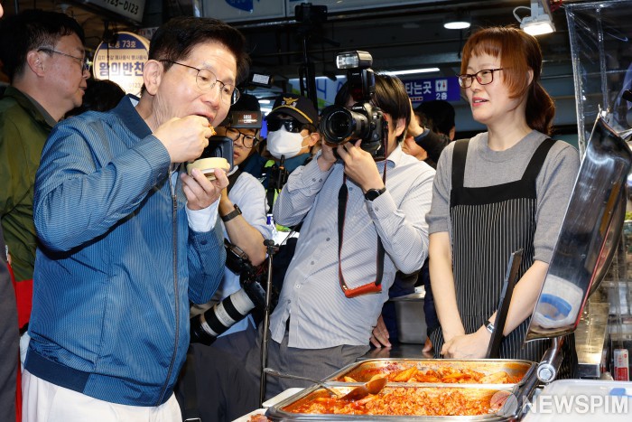 [의정부=뉴스핌] 이형석 기자 = 김문수 국민의힘 대통령 후보가 4일 오후 경기 의정부시 제일시장을 방문해 알곤이찜을 시식하고 있다. 2025.05.04 leehs@newspim.com