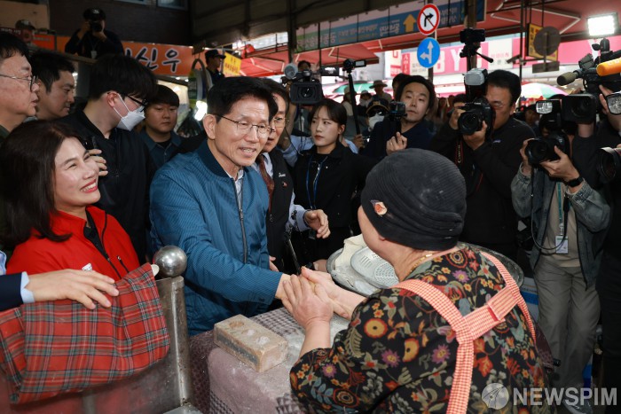 [의정부=뉴스핌] 이형석 기자 = 김문수 국민의힘 대통령 후보가 4일 오후 경기 의정부시 제일시장을 방문해 상인과 인사를 나누고 있다. 2025.05.04 leehs@newspim.com