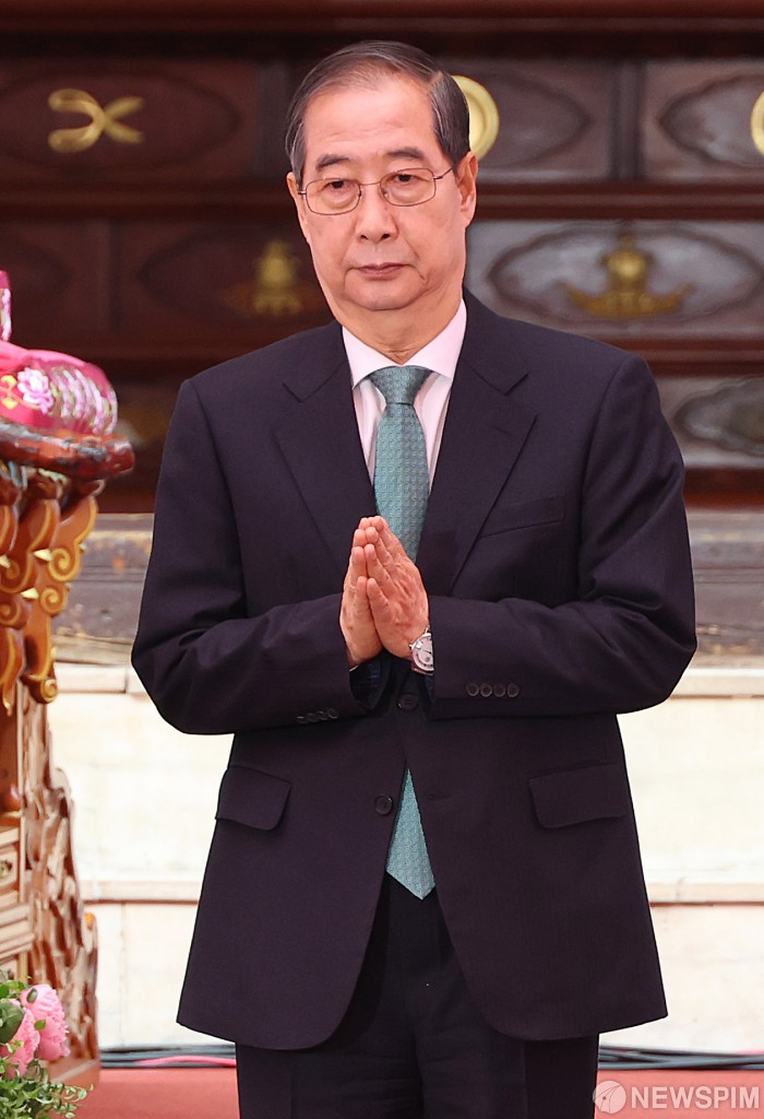 [서울=뉴스핌] 정일구 기자 = 한덕수 무소속 대선 예비후보가 5일 오전 서울 종로구 조계사에서 열린 불기 2569년 부처님오신날 봉축법요식에서 헌화한 뒤 합장하고 있다. 2025.05.05 mironj19@newspim.com