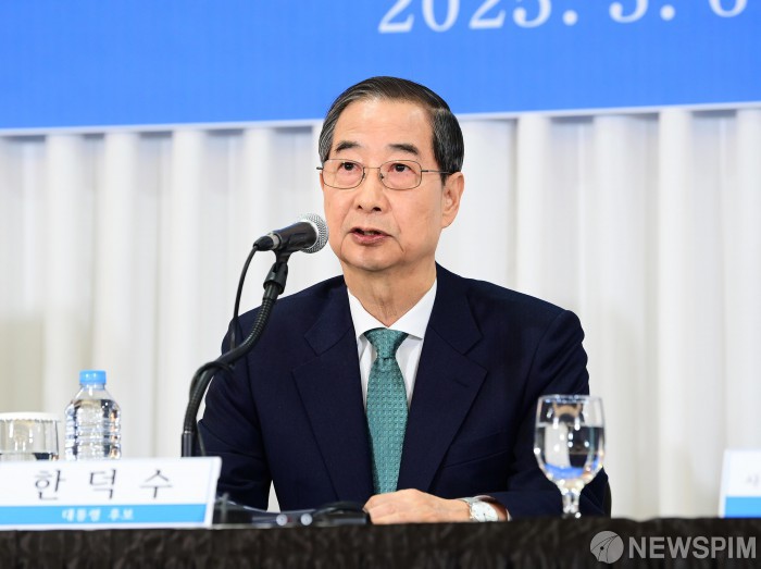 [서울=뉴스핌] 국회사진취재단 = 한덕수 무소속 대통령선거 예비후보가 6일 오전 서울 중구 코리아나 호텔에서 열린 관훈토론회에 참석해 기조연설을 하고 있다. 2025.05.06 photo@newspim.com