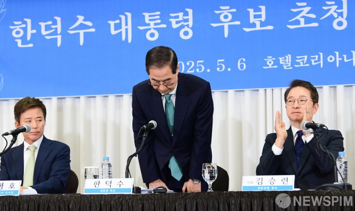 [서울=뉴스핌] 국회사진취재단 = 한덕수 무소속 대통령선거 예비후보가 6일 오전 서울 중구 코리아나 호텔에서 열린 관훈토론회에 참석해 인사하고 있다. 2025.05.06 photo@newspim.com