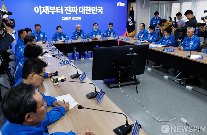 [서울=뉴스핌] 윤창빈 기자 = 박찬대 더불어민주당 총괄선거대책위원장이 7일 오전 서울 여의도 더불어민주당 중앙당사에서 열린 중앙선거대책위원회의에서 모두발언을 하고 있다. 2025.05.07 pangbin@newspim.com