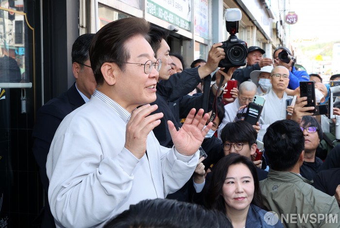 [진안=뉴스핌] 정일구 기자 = 골목골목 경청투어에 나선 이재명 더불어민주당 대선 후보가 7일 오전 전북 진안군 새참거리 인근에서 즉흥 연설을 하고 있다. 2025.05.07 mironj19@newspim.com