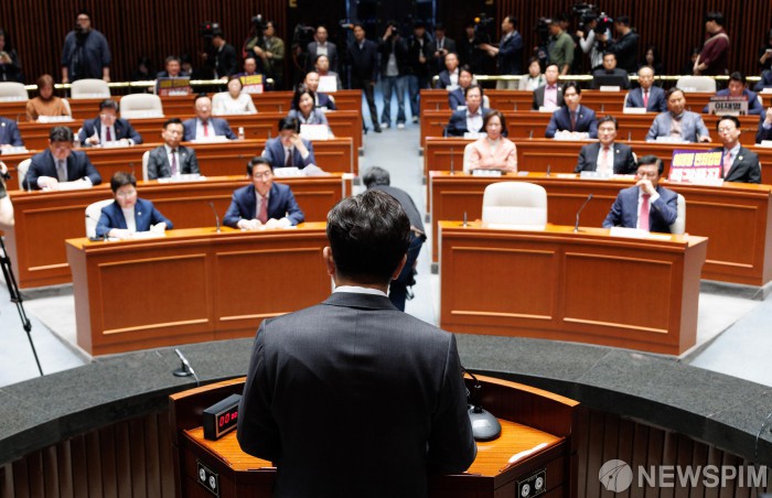 [서울=뉴스핌] 윤창빈 기자 = 권성동 국민의힘 원내대표가이 7일 오전 서울 여의도 국회에서 열린 의원총회에 서 모두발언을 하고 있다. 2025.05.07 pangbin@newspim.com