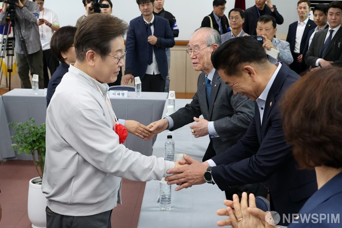 [익산=뉴스핌] 정일구 기자 = 골목골목 경청투어에 나선 이재명 더불어민주당 대선 후보가 7일 오후 전북 익산시 대한노인회 익산시지회에서 열린 노인회 임원과의 간담회에서 참석자들과 인사를 나누고 있다. 2025.05.07 mironj19@newspim.com