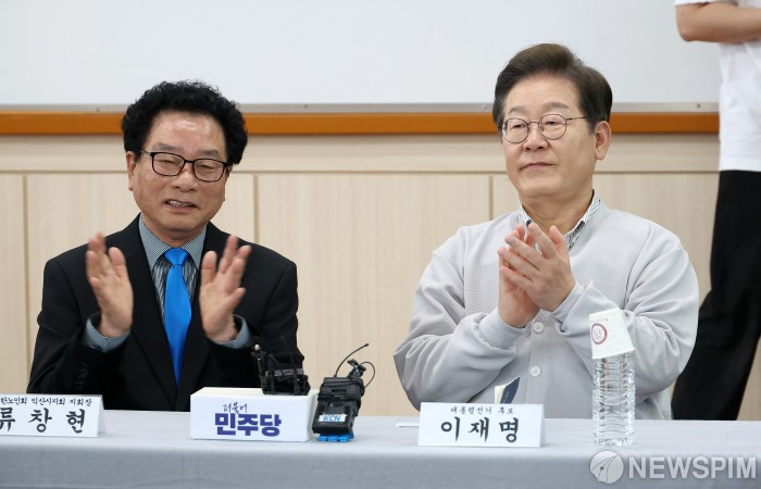 [익산=뉴스핌] 정일구 기자 = 골목골목 경청투어에 나선 이재명 더불어민주당 대선 후보가 7일 오후 전북 익산시 대한노인회 익산시지회에서 열린 노인회 임원과의 간담회에 참석해 박수치고 있다. 2025.05.07 mironj19@newspim.com