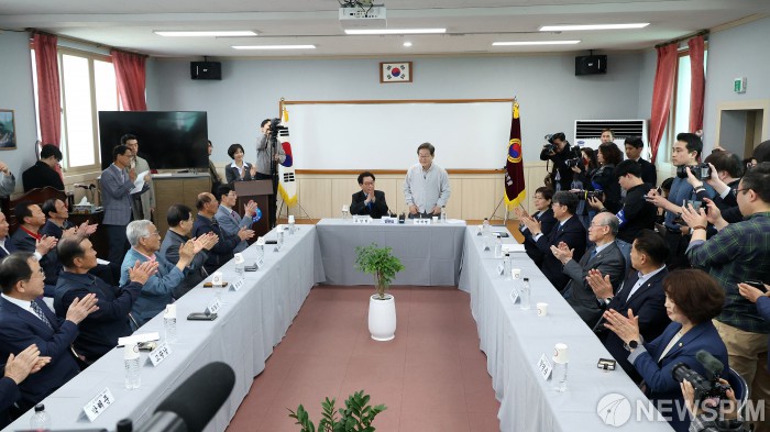 [익산=뉴스핌] 정일구 기자 = 골목골목 경청투어에 나선 이재명 더불어민주당 대선 후보가 7일 오후 전북 익산시 대한노인회 익산시지회에서 열린 노인회 임원과의 간담회에서 인사말을 하고 있다. 2025.05.07 mironj19@newspim.com