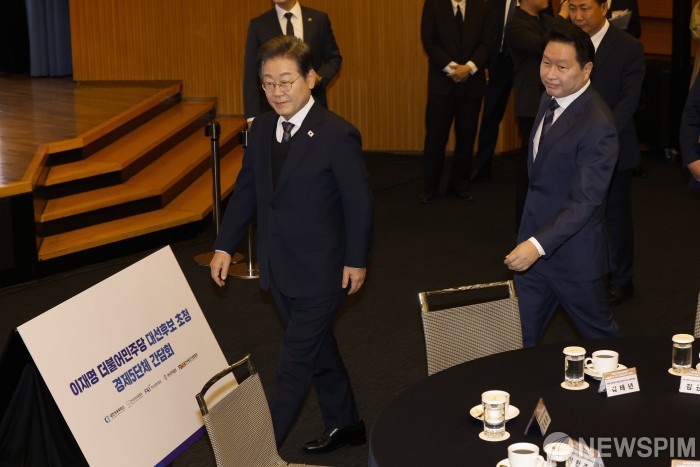 [서울=뉴스핌] 국회사진취재단 = 이재명 더불어민주당 대선 후보와 최태원 대한상공회의소 회장이 8일 오전 서울 중구 대한상공회의소에서 열린 이재명 후보 초청 경제5단체 간담회에 참석하고 있다. 2025.05.08 photo@newspim.com