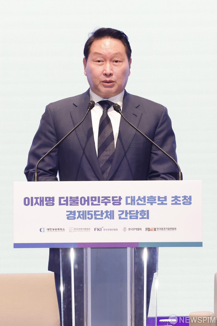 [서울=뉴스핌] 국회사진취재단 = 최태원 대한상공회의소 회장이 8일 오전 서울 중구 대한상공회의소에서 열린 이재명 더불어민주당 대선후보 초청 경제5단체 간담회에서 환영사를 하고 있다. 2025.05.08 photo@newspim.com