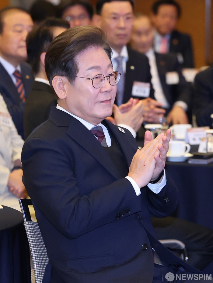 [서울=뉴스핌] 국회사진취재단 = 이재명 더불어민주당 대선 후보가 8일 오전 서울 중구 대한상공회의소에서 열린 경제5단체 간담회에 참석해 최태원 대한상공회의소 회장의 환영사를 듣고 박수치고 있다. 2025.05.08 photo@newspim.com