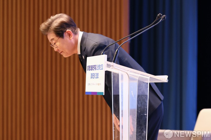 [서울=뉴스핌] 국회사진취재단 = 이재명 더불어민주당 대선 후보가 8일 오전 서울 중구 대한상공회의소에서 열린 대선후보 초청 경제5단체 간담회에서 발언을 마치고 인사하고 있다. 2025.05.08 2025.05.08 photo@newspim.com
